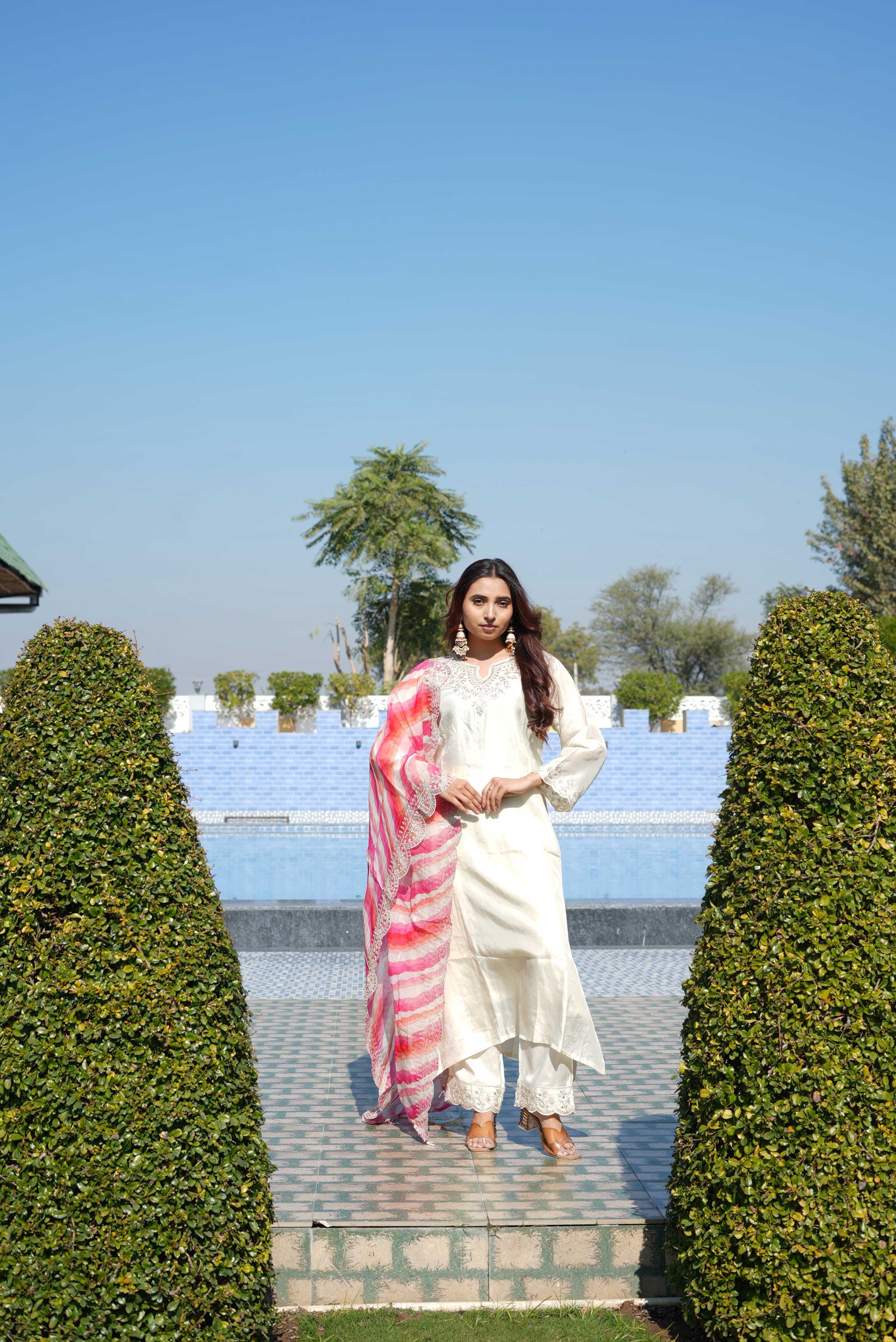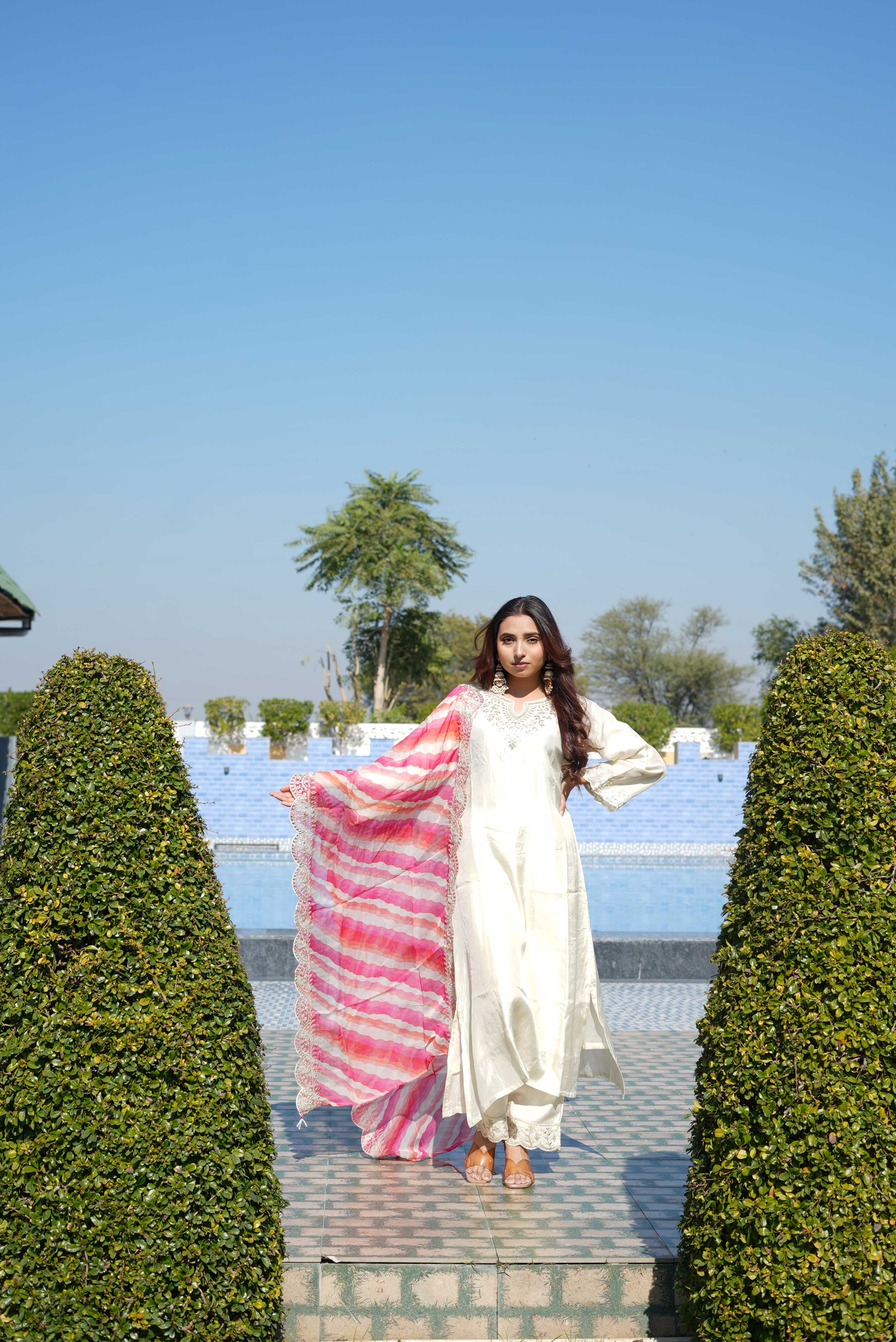 The highlight of this ensemble is its stunning pink and coral lehariya dupatta, adorned with soft wave patterns and finished with a graceful lace border. The airy fabric drapes effortlessly, creating beautiful movement and adding a splash of color to the soothing ivory base. Paired with matching straight pants detailed at the hem, this set strikes the perfect balance between tradition and contemporary style.