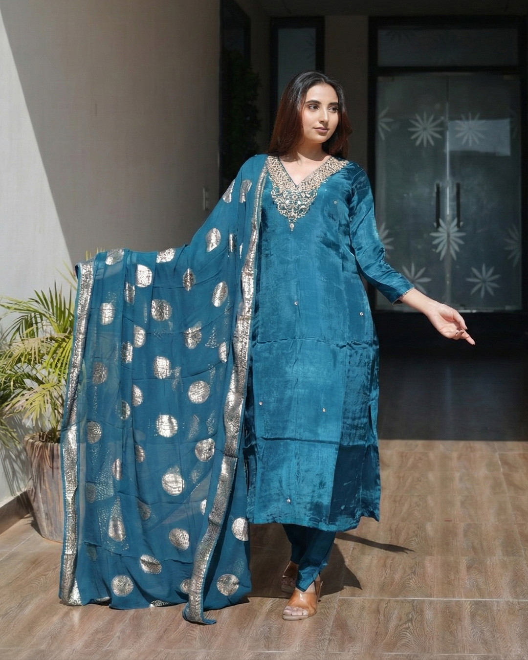 Step into timeless sophistication with our Royal Plum Elegance Kurta Set, designed for women who appreciate understated glamour. Crafted in a rich plum hue, this ensemble blends modern tailoring with subtle ethnic detailing, making it perfect for festive gatherings, evening events, and special celebrations.The kurta features a graceful V-neckline adorned with delicate embellished borders that add a refined shimmer. The three-quarter sleeves are finished with matching detailed cuffs, enhancing th...